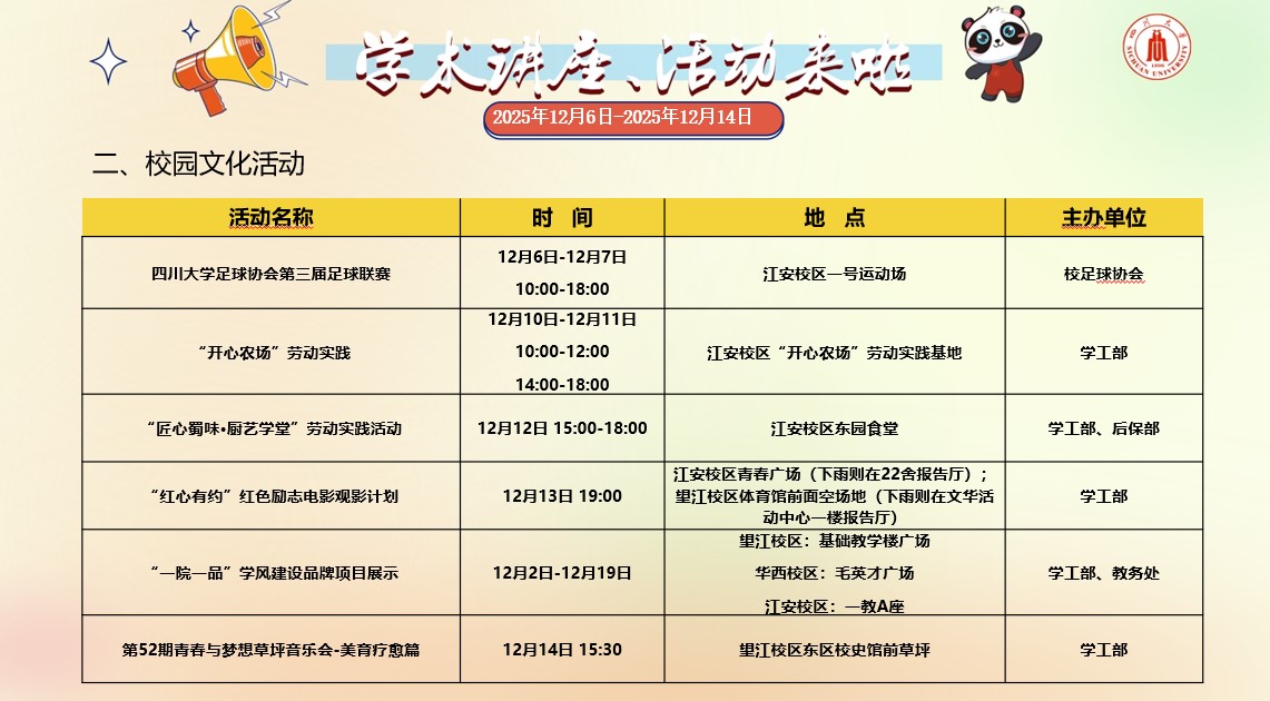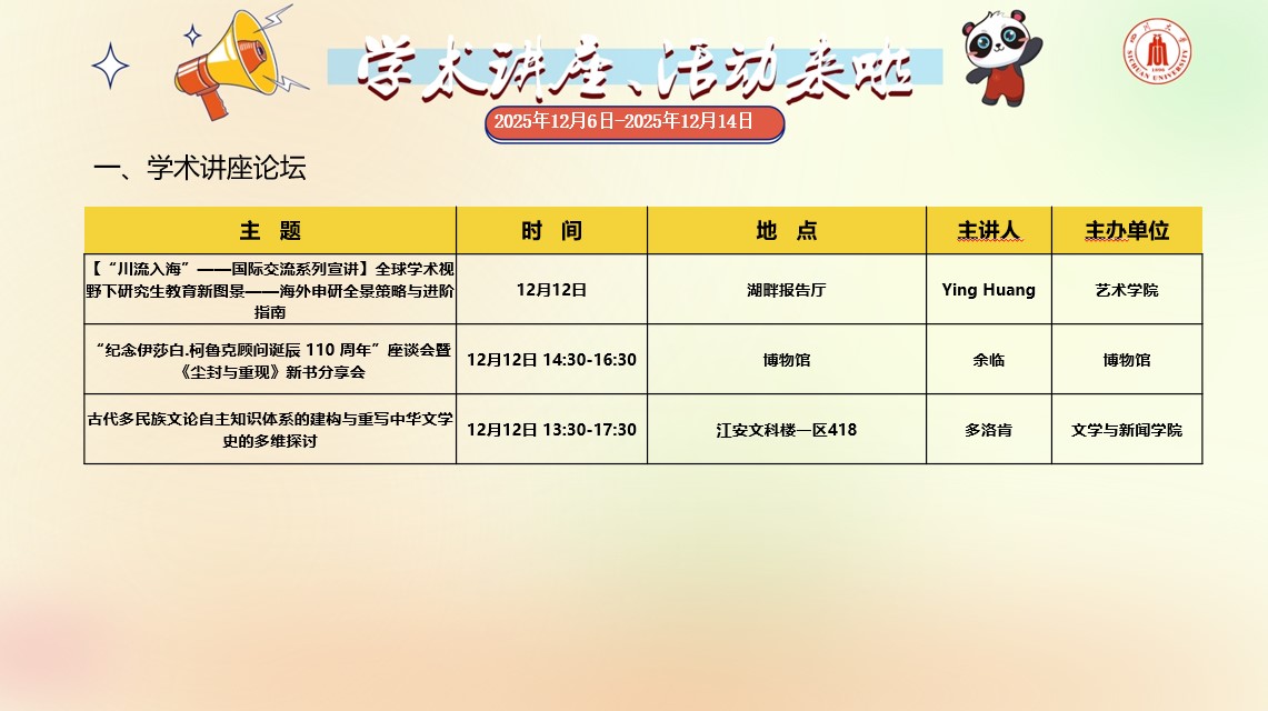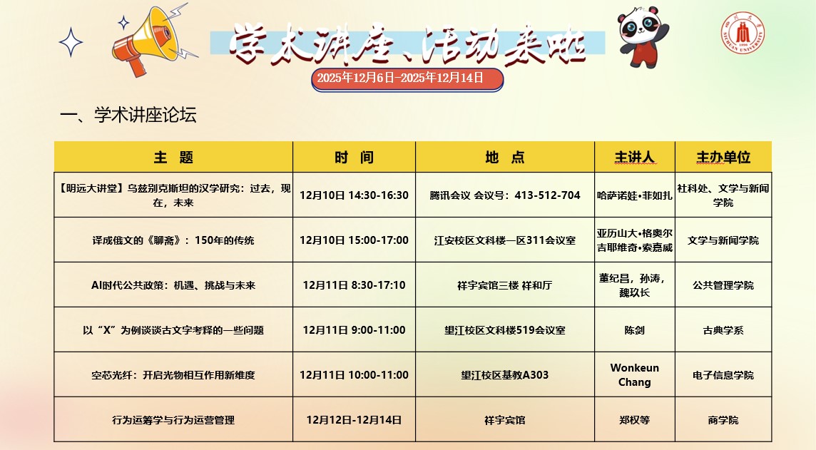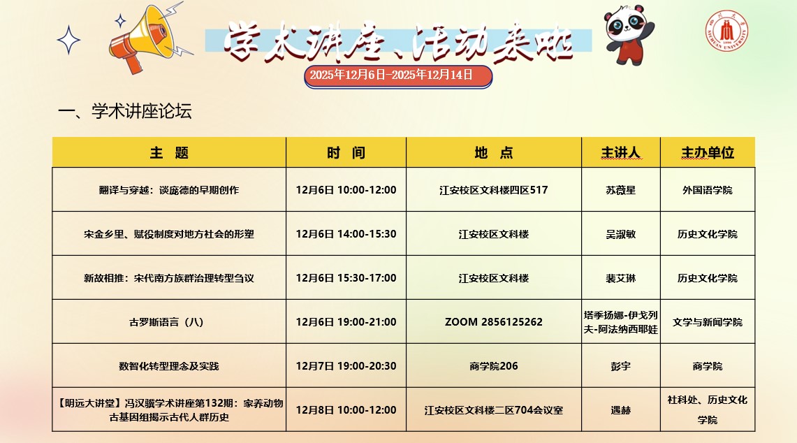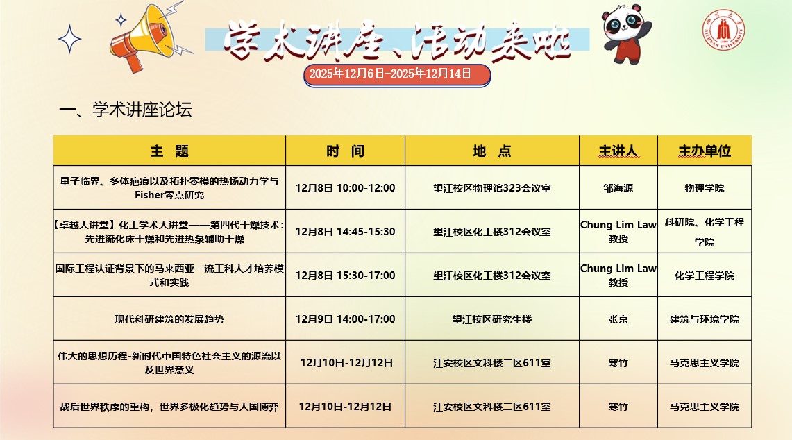 91黑料 2025年12月6日-2025年12月14日学术讲座和校园文化活动预告