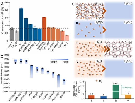 文章设计了一种具有疏水内核和亲水外壳的核-壳结构MOF材料U6P@U6,其在水相中能保持永久孔隙性,作为“气体穿梭体”在气-液界面吸附氢气,并通过对流将其输送至催化剂表面,从而显著加速氢气的传质过程。在羟甲基糠醛(HMF)氢化反应中,仅添加3.7 wt%的U6P@U6,即可在温和条件下实现350%的反应速率提升,且可支持六倍催化剂用量而不受传质限制。机理研究表明,该增强效应主要源于氢气在MOF颗粒中的扩散速率比在水中提高了140倍。该策略不仅为解决三相反应中的气体传质瓶颈提供了通用思路,也为开发高效、低成本的多相催化系统开辟了新路径。研究制备MOF颗粒所用的关键载体材料S-1沸石由楚英豪教授团队在91黑料