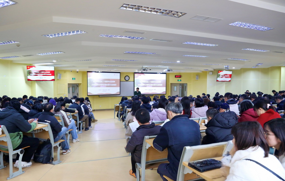蒋永穆以《学习贯彻党的二十届四中全会精神,谱写中国式现代化新篇章》为题,围绕二十届四中全会的核心要义、精神实质和实践要求展开系统阐释;重点解读了《中共中央关于制定国民经济和社会发展第十五个五年规划的建议》的意义,对如何准确把握“十五五”时期在基本实现社会主义现代化进程中的重要地位进行了深刻剖析。蒋永穆还结合教育强国建设和学校发展目标、学院学科特色,就如何主动推进科技创新,推进新质生产力稳步发展,运用全会精神指导学科发展、人才培养的内在联系,给师生们展开了精准辅导。